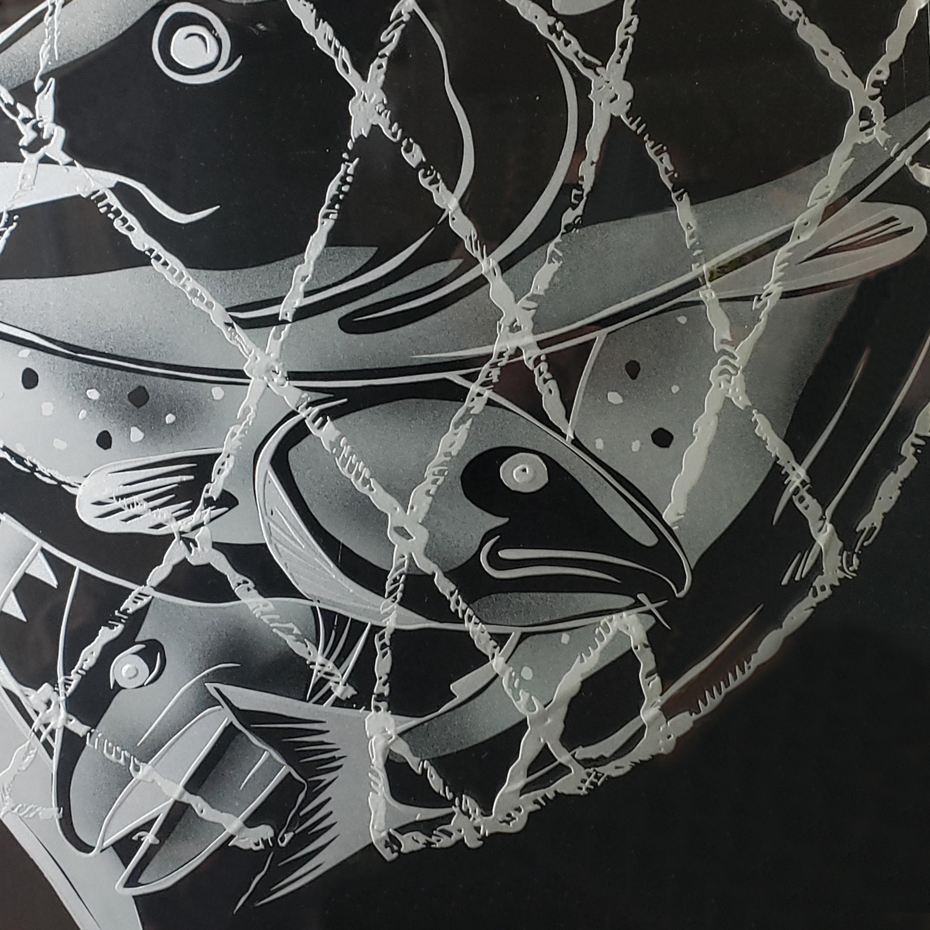 Though this collection includes similar stylistic elements to the ‘Figures’ & ‘Abstract’ categories, ‘Animals’ incorporates slightly more realism and primarily focuses on endangered species. These paintings and engravings are created with the intent of capturing how inextricably interconnected we are to other sentient beings and our shared natural environments. All designs are either painted in grisaille or engraved with rotary tools, hand filing or sandblasting on machine-made or mouth-blown glass.
